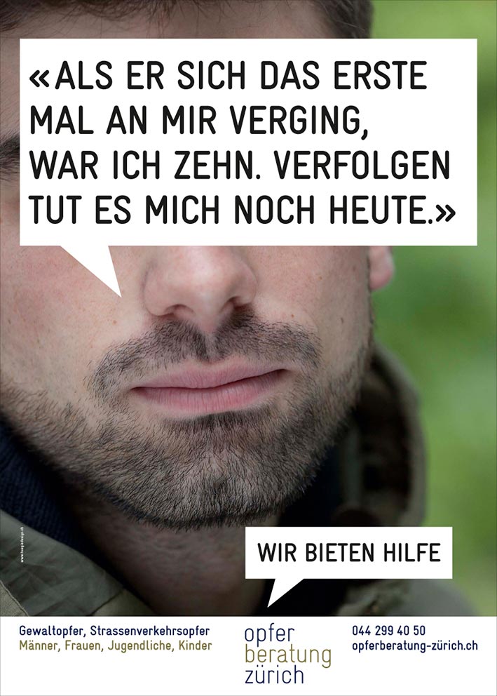 Seit 2010 tritt die Opferberatung Zürich mit einer Kampagne in öffentlichen Verkehrsmitteln jeweils gegen Jahresende an die Öffentlichkeit. Solche Kampagnen sind nur dank Spenden möglich.